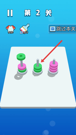 3、進(jìn)入第2關(guān),面對(duì)更多顏色和數(shù)量的圓環(huán),繼續(xù)移動(dòng)圓環(huán),將同色圓環(huán)歸位到對(duì)應(yīng)的柱子上,挑戰(zhàn)更復(fù)雜的歸位。