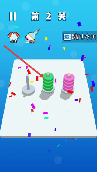 4、成功將所有圓環(huán)按要求歸位后,會(huì)出現(xiàn)慶祝效果,彩色紙屑飄落,標(biāo)志著第2關(guān)順利通關(guān),可繼續(xù)挑戰(zhàn)后續(xù)關(guān)卡。
