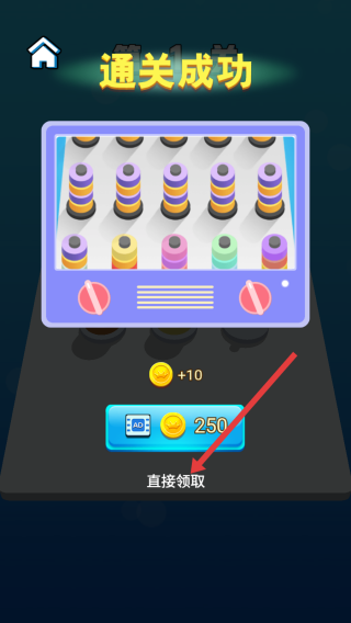 2、成功完成第1關(guān)后,會(huì)顯示通關(guān)成功界面,能獲得金幣獎(jiǎng)勵(lì),點(diǎn)擊直接領(lǐng)取,獲取獎(jiǎng)勵(lì)進(jìn)入下一關(guān)。