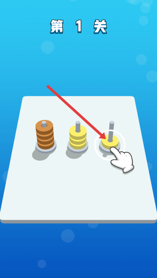 1、游戲開始,進(jìn)入第1關(guān)按照提示,移動(dòng)不同顏色的圓環(huán),將它們放置到對(duì)應(yīng)的柱子上,進(jìn)行圓環(huán)歸位操作。