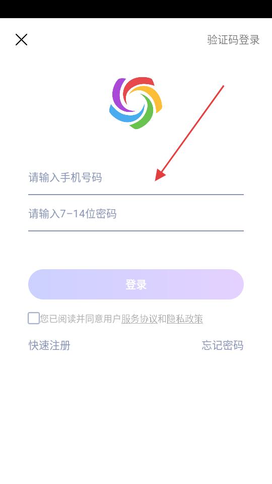2、登錄界面,需填寫手機號碼與7到14位密碼,勾選協(xié)議后點登錄,也可通過快速注冊、忘記密碼操作。