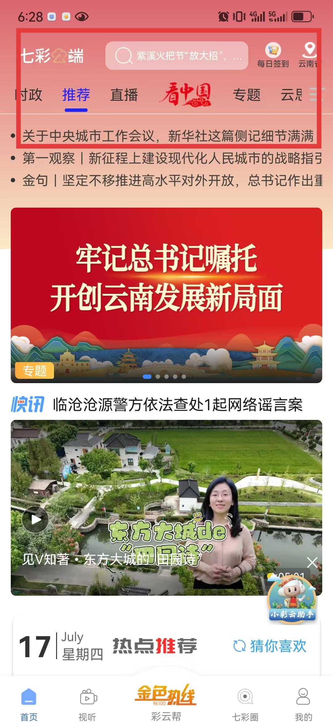 1、首頁頂部有搜索欄和分類入口,像時政、推薦、直播等,我想找云南臺節(jié)目或資訊,能直接搜關(guān)鍵詞,也可點分類看對應內(nèi)容,輕松開啟視聽之旅。