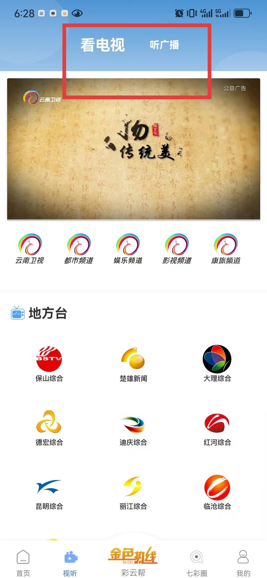 2、視聽頁面頂部有看電視、聽廣播選項,想看云南臺節(jié)目時點看電視,下面羅列著云南衛(wèi)視、都市頻道等多個頻道,還有保山綜合、楚雄新聞等地方臺。