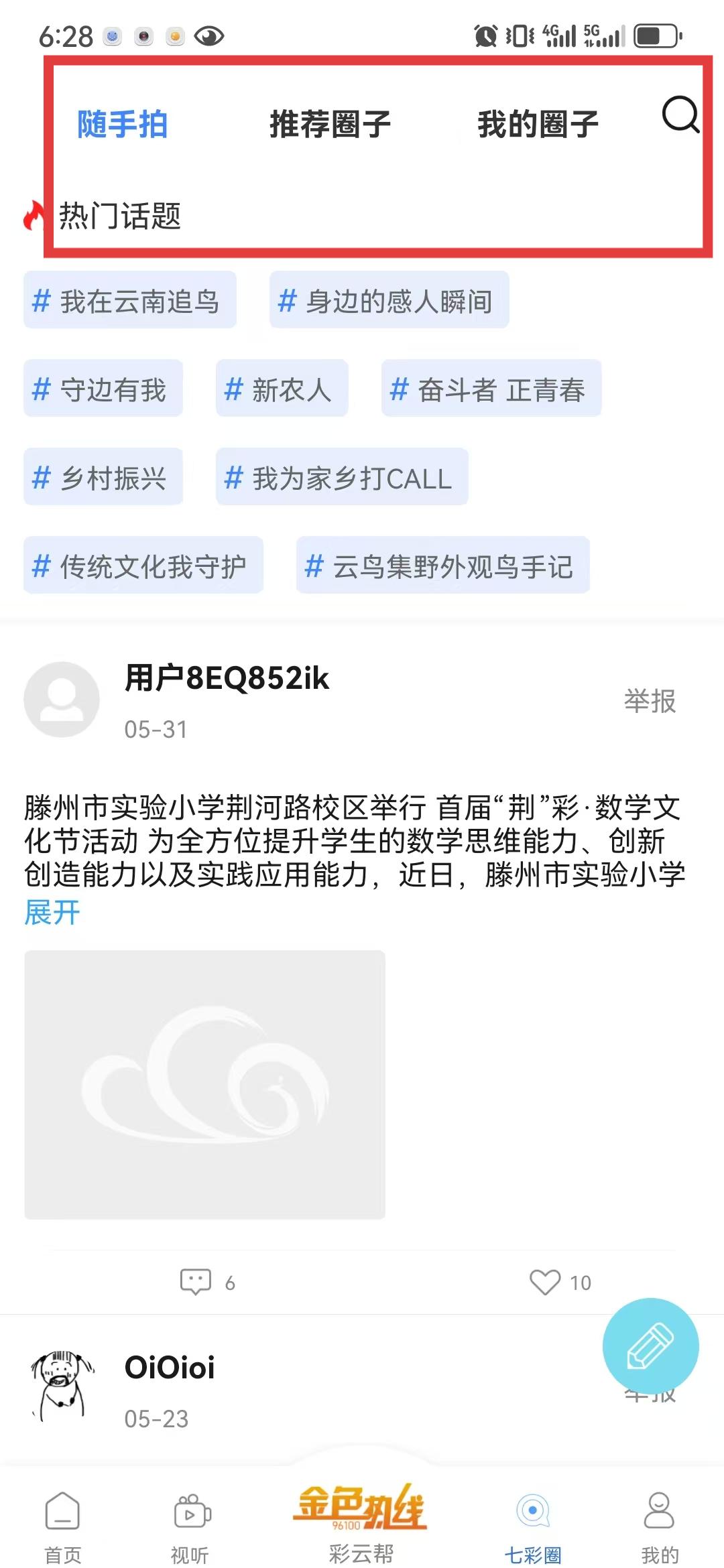3、七彩圈頁面頂部有隨手拍、推薦圈子、我的圈子選項,想分享云南的美景就點隨手拍,想找有趣的社群選推薦圈子,我的圈子則能管理自己創(chuàng)建或加入的圈子。