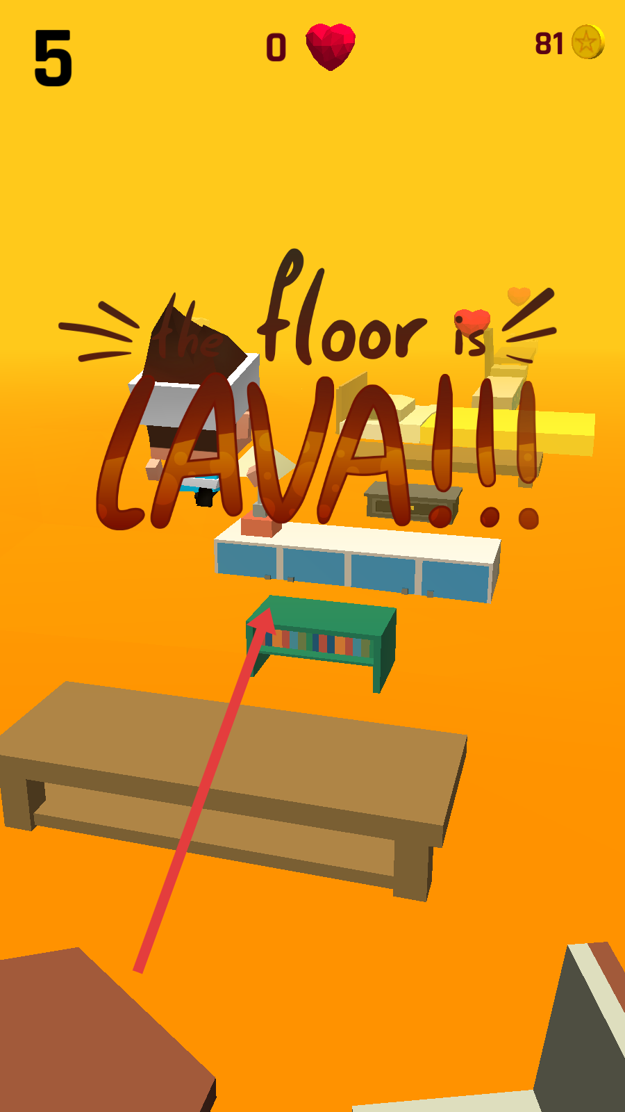 4、當(dāng)看到the floor is LAVA提示時,意味著地面巖漿情況更危險,要更加謹慎地操控角色在家具上跳躍,玩家如果掉落游戲失敗。