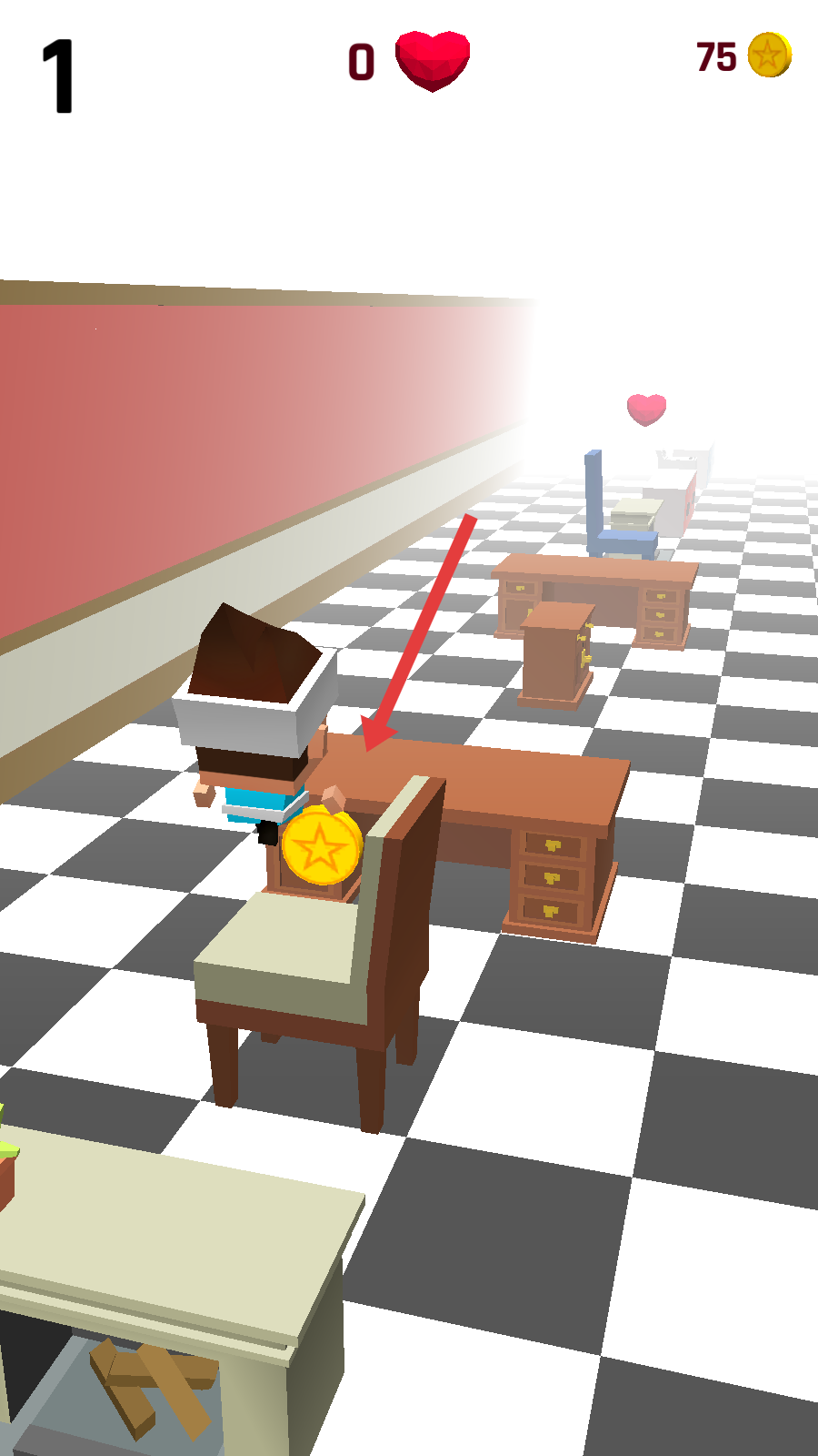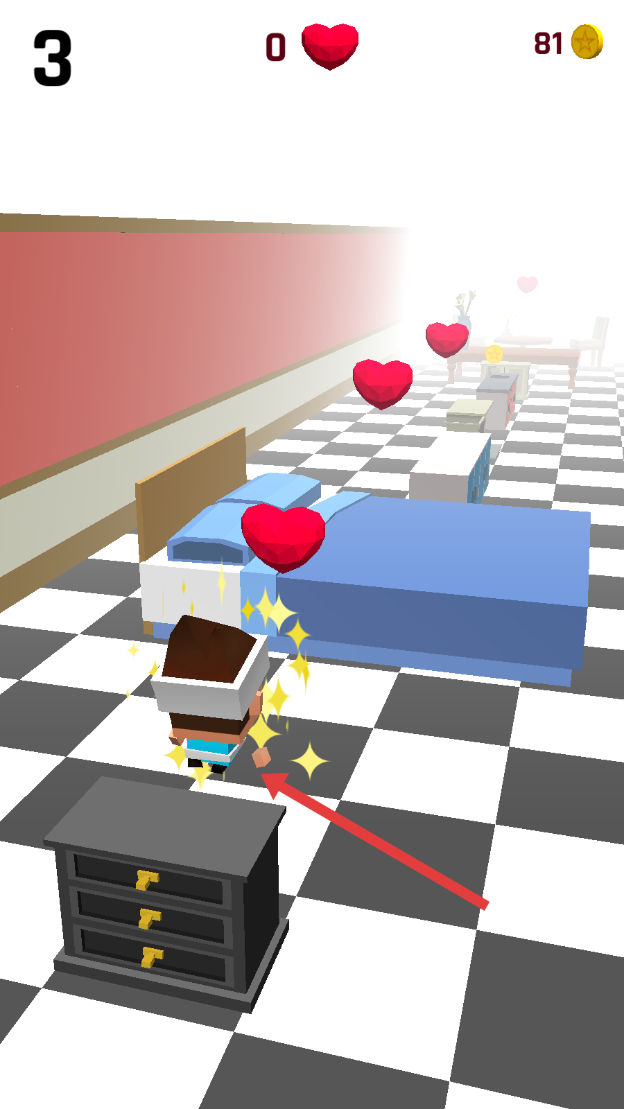 2、通過點擊屏幕等操作,操控大頭角色在家具如桌子、椅子、床等之間跳躍移動要注意避開地面。