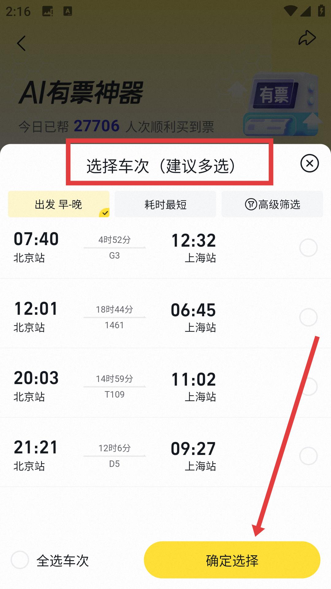 3、進(jìn)入車次詳情后來到選擇車次界面,根據(jù)自身需求,從列出的車次中挑選,選好后點擊確定選擇按鈕。