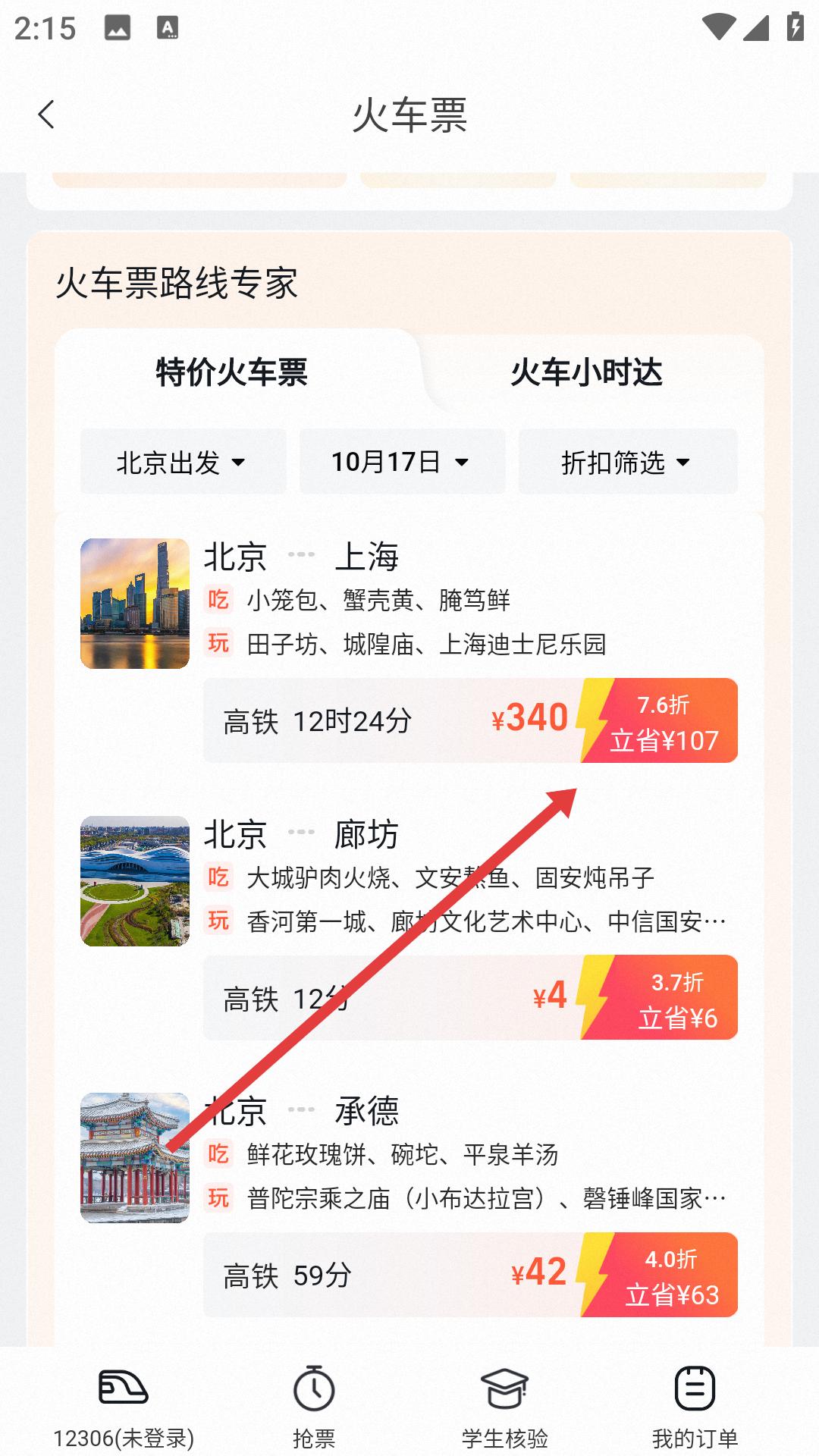 2、在顯示的車次信息里瀏覽不同車次的價格、時長等,挑選合適的車次,點擊進(jìn)入該車次的詳情頁面。