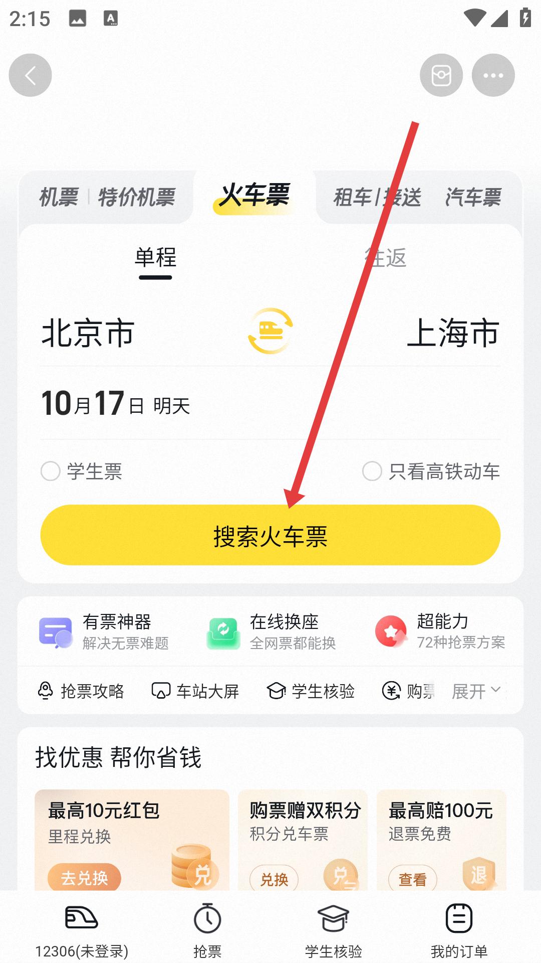 1、進(jìn)入火車票預(yù)訂界面選擇出發(fā)地北京市、目的地上海市,日期選10月17日,點擊搜索火車票按鈕,獲取相關(guān)車次信息。