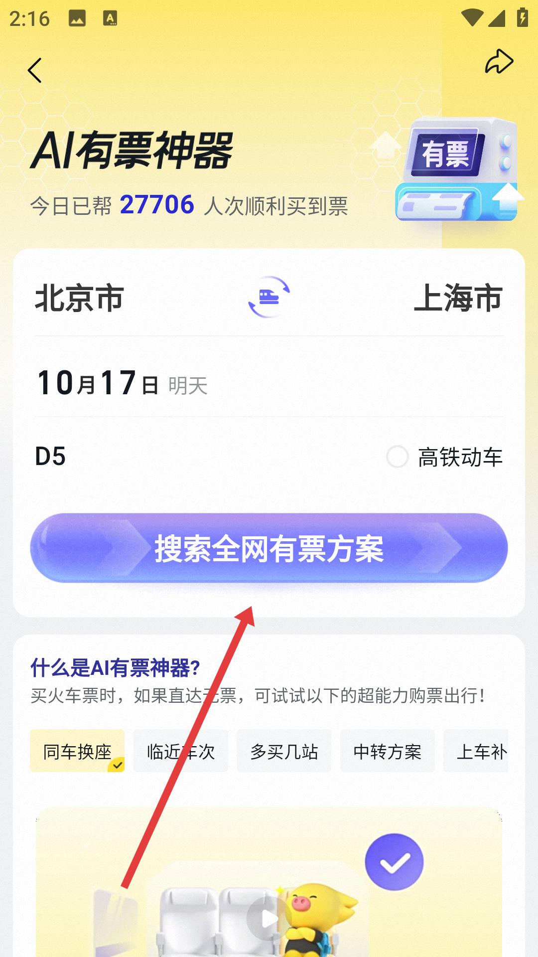 4、確定車次后進(jìn)入AI有票神器相關(guān)頁面,點擊搜索全網(wǎng)有票方案按鈕,查找該車次的有票情況,推進(jìn)后續(xù)購票流程。