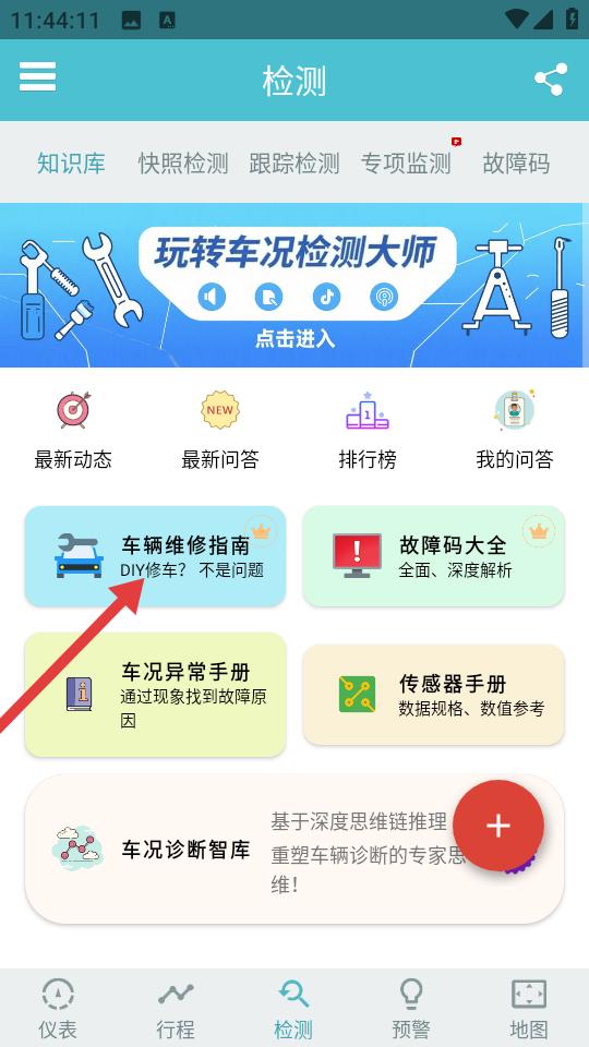 1、檢測(cè)頁(yè)面頂部有知識(shí)庫(kù)、快照檢測(cè)等選項(xiàng),中間展示最新動(dòng)態(tài)等功能區(qū),還有車(chē)輛維修指南等實(shí)用手冊(cè),底部加號(hào)可拓展操作,助力車(chē)主了解車(chē)況。