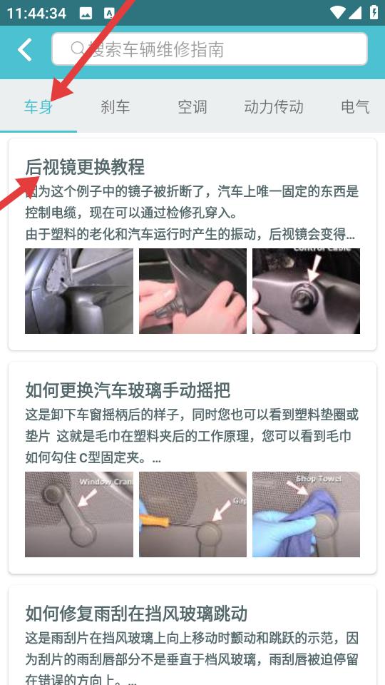 2、車(chē)輛維修指南界面分類(lèi)展示車(chē)身、剎車(chē)等板塊,車(chē)身類(lèi)有后視鏡更換教程等內(nèi)容,配步驟圖片,詳細(xì)講解維修方法,幫助車(chē)主自助解決車(chē)輛小問(wèn)題。