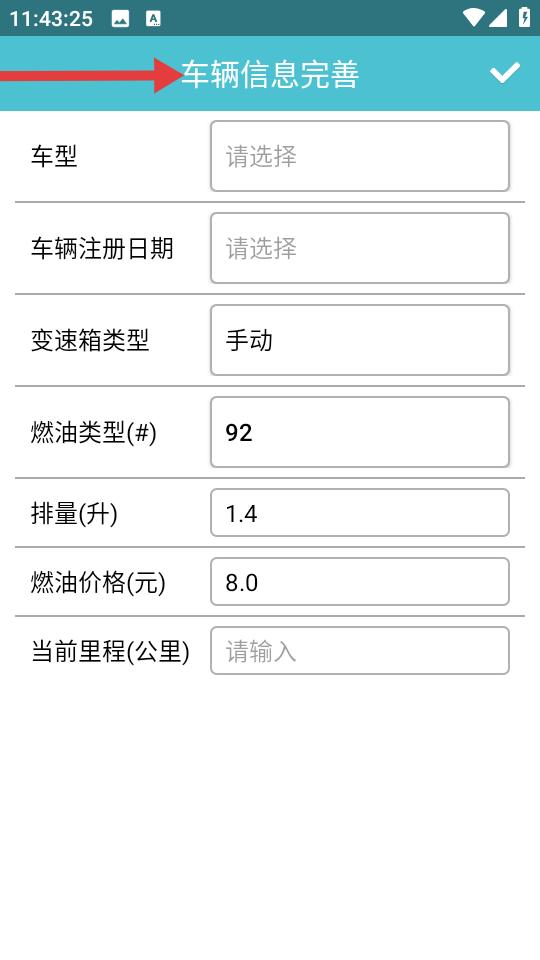 3、車(chē)輛信息完善界面需依次填寫(xiě)車(chē)型、車(chē)輛注冊(cè)日期等信息,當(dāng)前變速箱類(lèi)型顯示手動(dòng)、燃油類(lèi)型、排量、燃油價(jià)格當(dāng)前里程欄待輸入,頂部對(duì)勾可提交信息。