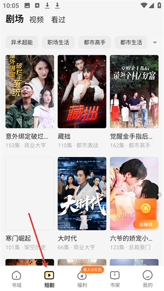 2、短劇頁(yè)面分異術(shù)超能等類別,展示意外綁定破爛、藏拙等短劇,涵蓋商業(yè)大亨、都市激戰(zhàn)等題材供用戶觀看。