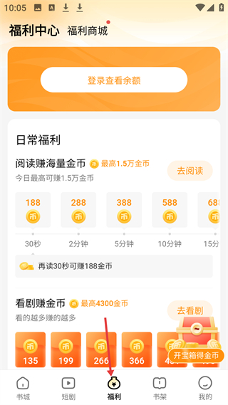 3、福利中心頁(yè)面可登錄查余額,有閱讀、看劇賺金幣活動(dòng),閱讀時(shí)長(zhǎng)越久金幣越多,還能開寶箱得金幣激勵(lì)用戶參與。