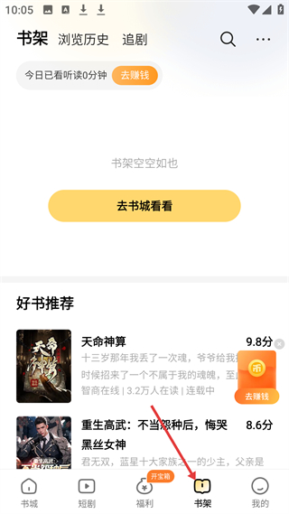 4、書架頁(yè)面可查看瀏覽歷史、追劇,書架為空時(shí)可去書城選書,同時(shí)推薦天命神算等好書,助力用戶發(fā)現(xiàn)優(yōu)質(zhì)內(nèi)容。