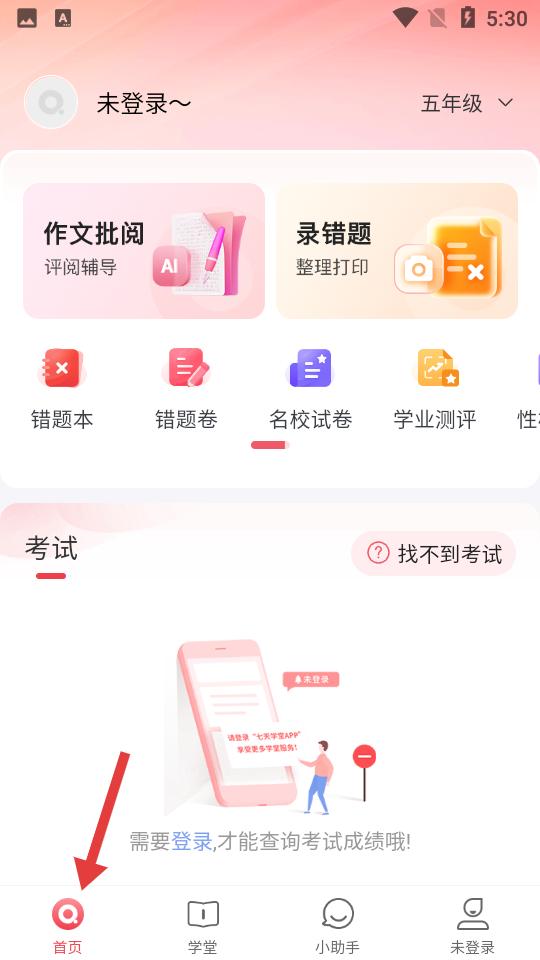 1、點(diǎn)擊首頁,呈現(xiàn)未登錄狀態(tài),設(shè)有作文批閱、錄錯題等功能板塊,登錄后方可查詢考試成績。