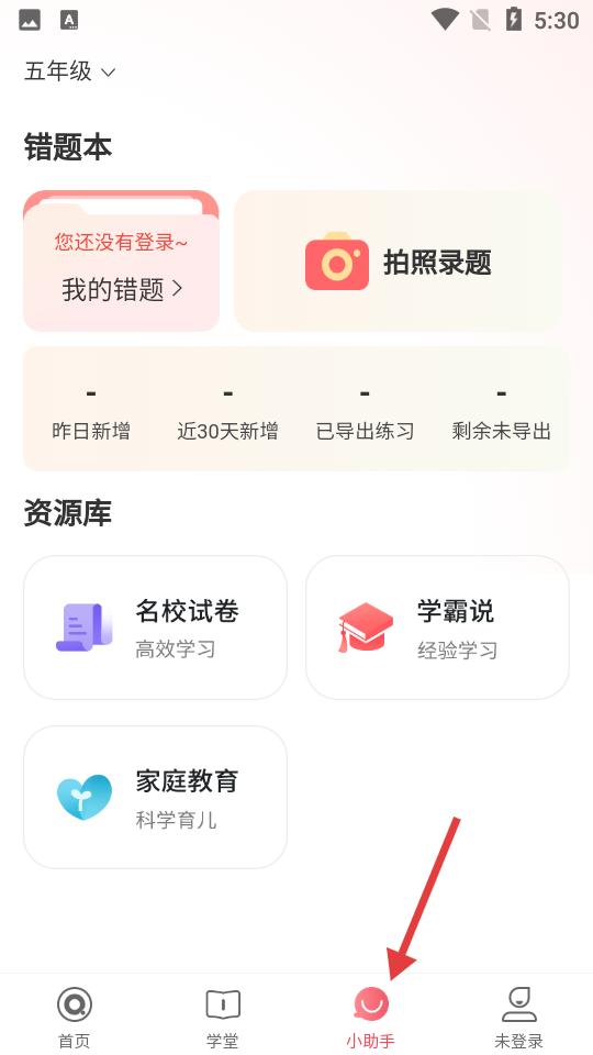 3、點(diǎn)擊錯題本與資源庫頁面,含拍照錄題、名校試卷等功能,底部小助手導(dǎo)航,方便獲取學(xué)習(xí)支持。