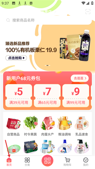 2、首頁推有機(jī)板栗仁新品19.9元,新用戶享68元券包,有自營(yíng)商品、時(shí)令果蔬等功能入口,便于選購。