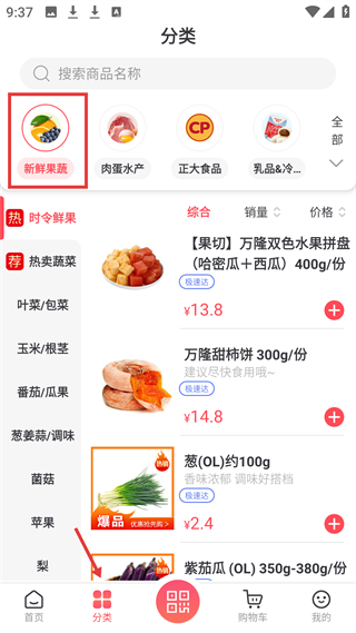 3、分類頁新鮮果蔬,有時(shí)令鮮果等分類,展示水果拼盤、甜柿餅、蔥等商品,價(jià)格明確且支持極速達(dá)。