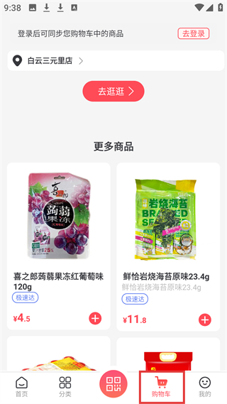 4、購物車頁提示登錄同步商品,有蒟蒻果凍、巖燒海苔等商品,標(biāo)注價(jià)格及極速達(dá)服務(wù),可添加購物車。
