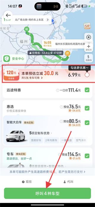 2、查看車型及價(jià)格后若有多種車型可選,點(diǎn)擊呼叫4種車型,進(jìn)入車型選擇確認(rèn)頁(yè)面。