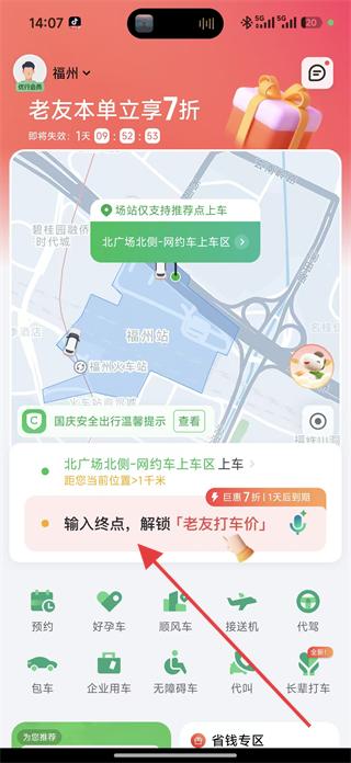 1、打開(kāi)曹操出行APP,進(jìn)入打車頁(yè)面,在輸入終點(diǎn)處輸入目的地,解鎖老友打車價(jià),查看相關(guān)車型及價(jià)格信息。