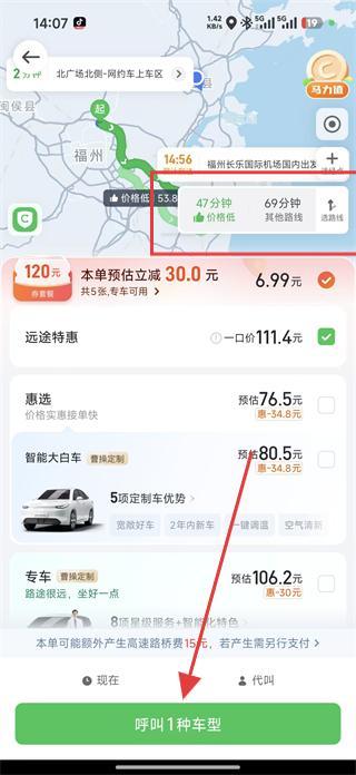 3、在車型選擇確認(rèn)頁(yè)面根據(jù)需求選擇其中一種車型,點(diǎn)擊呼叫1種車型,進(jìn)入預(yù)付車費(fèi)頁(yè)面。