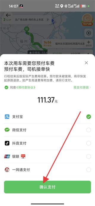 4、在預(yù)付車費(fèi)頁(yè)面選擇合適的支付方式,比如支付寶,然后點(diǎn)擊確認(rèn)支付,完成車費(fèi)預(yù)付,等待司機(jī)接單。