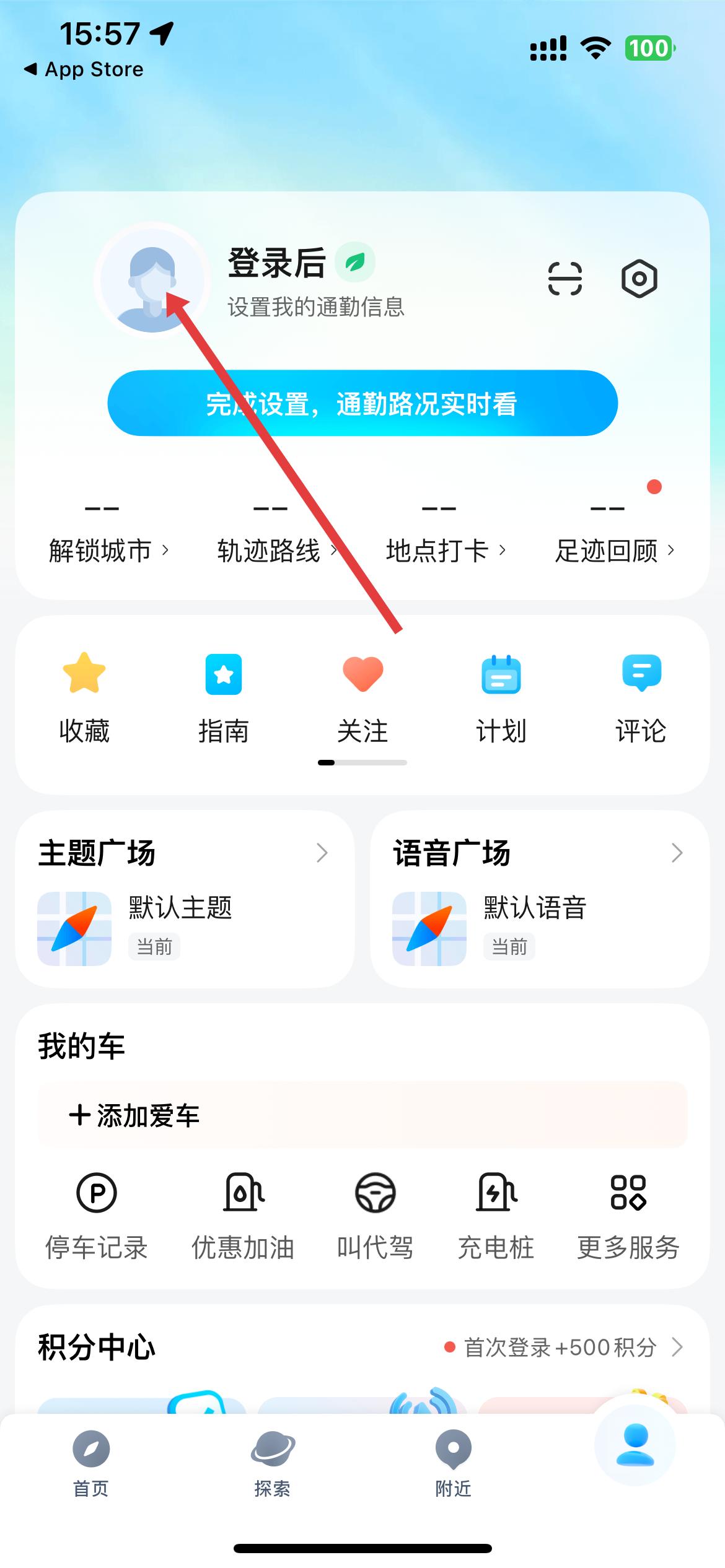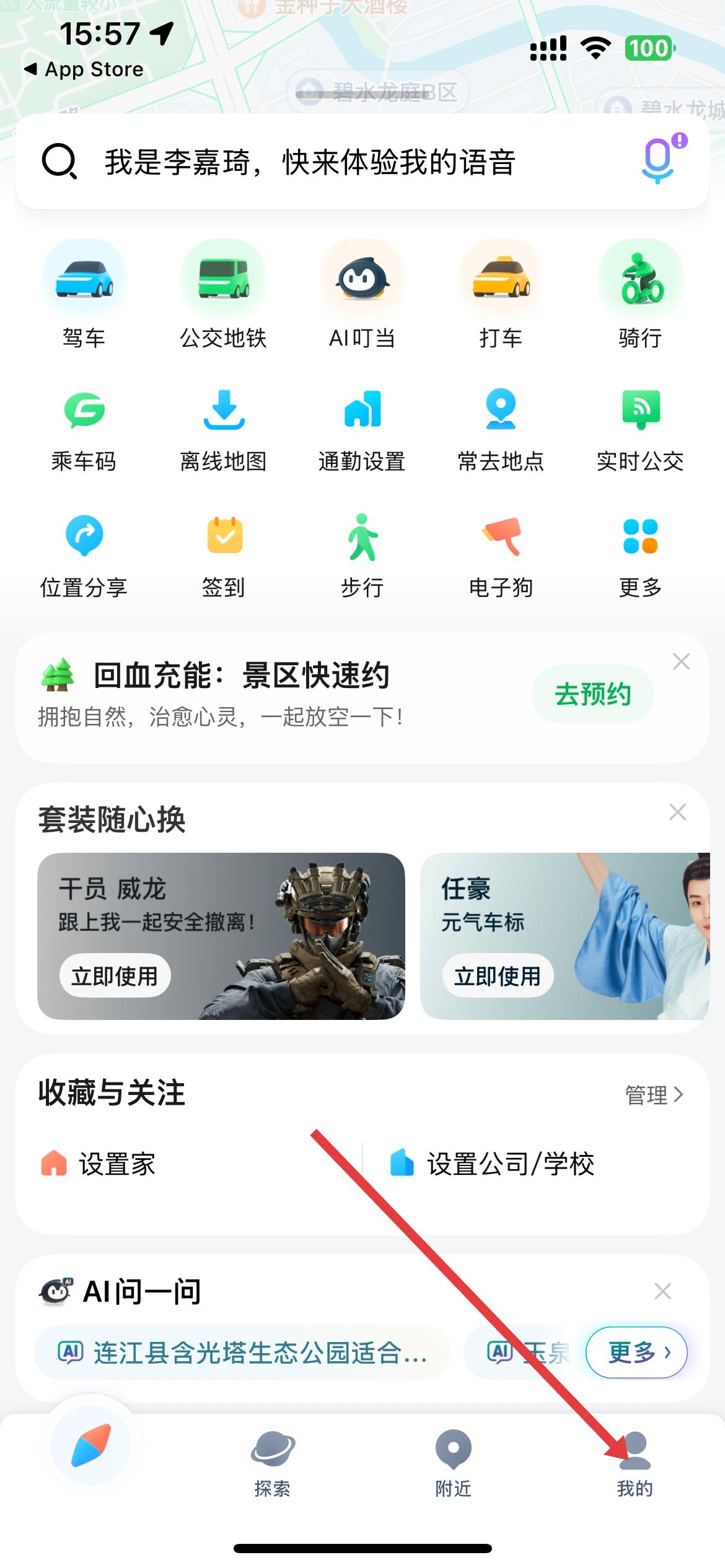 2、APP主界面呈現(xiàn)地圖視圖,底部有駕車、公交地鐵、打車等出行功能入口,搜索欄可查詢內(nèi)容,下方導(dǎo)航欄含首頁、探索、附近、我的。