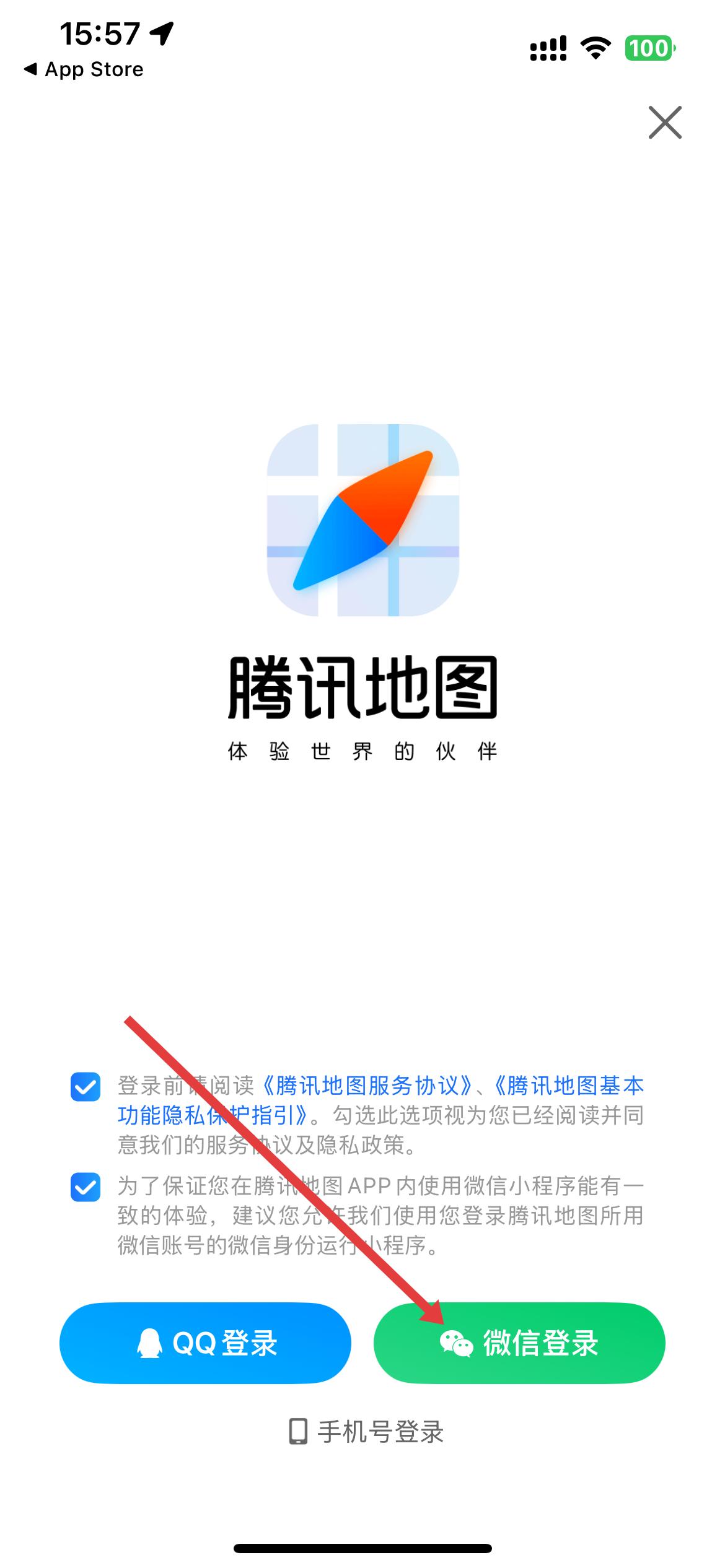 4、登錄頁面,有QQ登錄、微信登錄、手機(jī)號登錄選項(xiàng),勾選相關(guān)協(xié)議后,選擇微信登錄,即可通過微信登錄騰訊地圖。