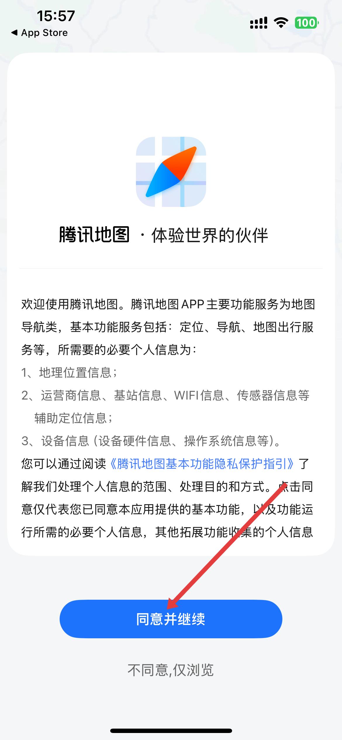 1、打開騰訊地圖,進(jìn)入歡迎頁面,能看到騰訊地圖的功能服務(wù)介紹,點(diǎn)擊同意并繼續(xù)。
