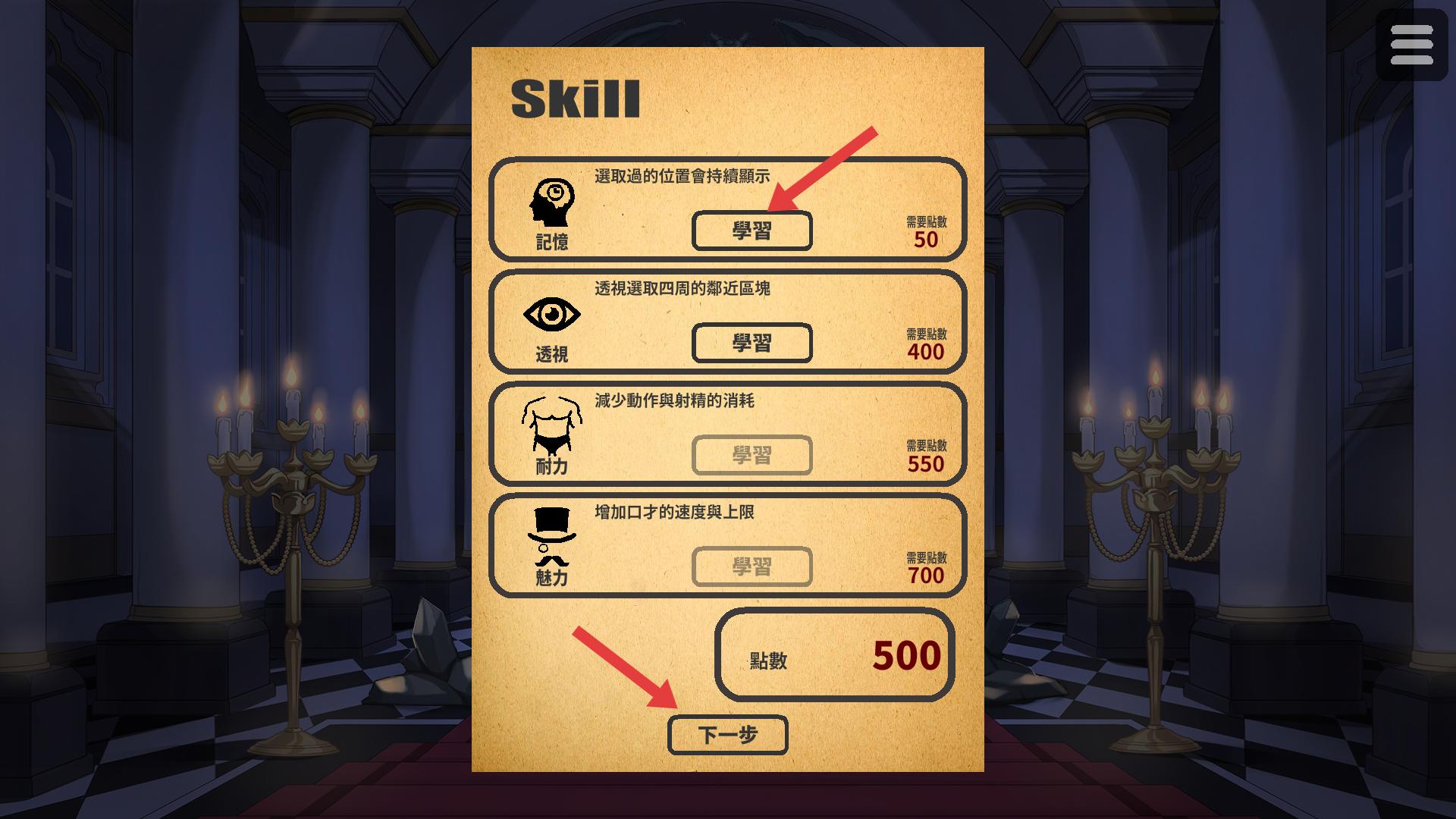 1、在技能界面可學(xué)習(xí)記憶、透視等技能,記憶技能需50點(diǎn)數(shù),若點(diǎn)數(shù)足夠,點(diǎn)擊學(xué)習(xí)學(xué)習(xí)記憶技能,之后點(diǎn)擊下一步繼續(xù)游戲。