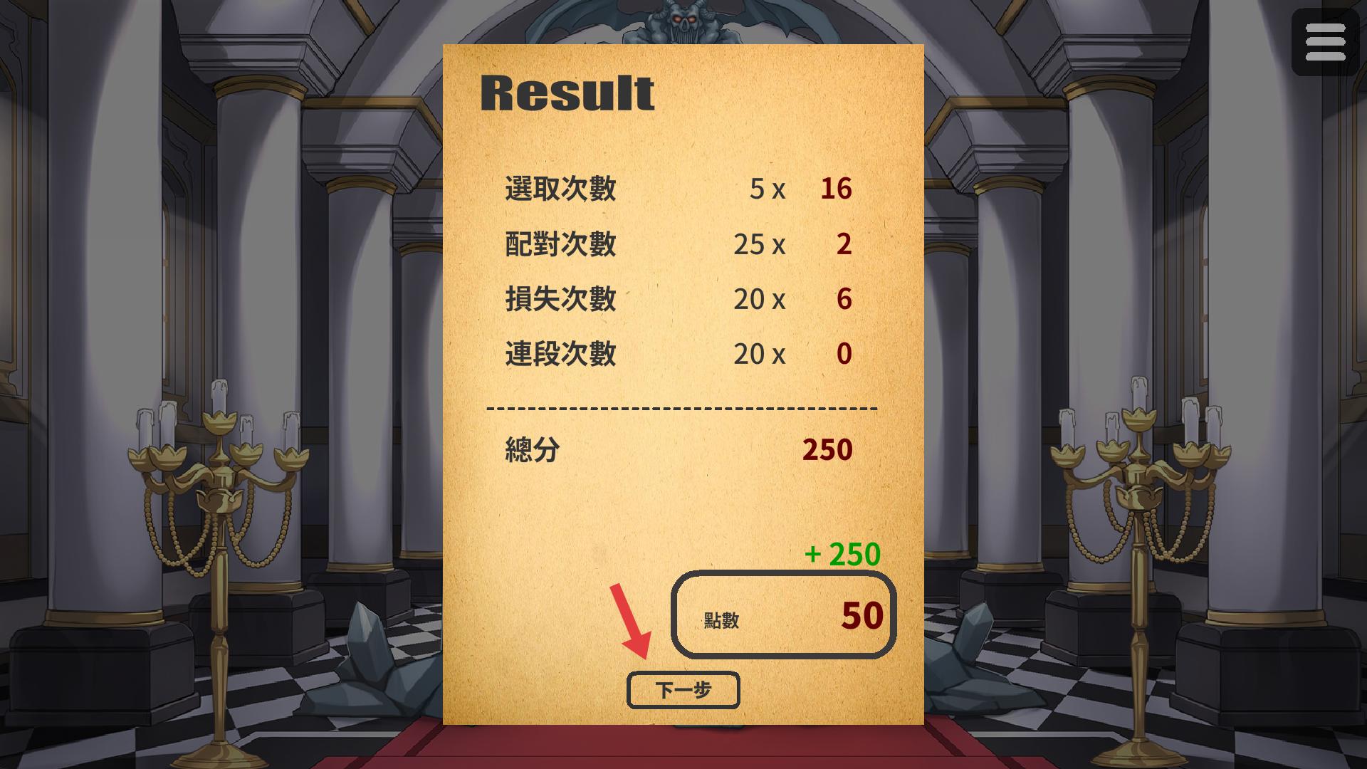 4、游戲結(jié)束后,會顯示結(jié)果界面,包含選取次數(shù)、配對次數(shù)等數(shù)據(jù)和總分,查看后點(diǎn)擊下一步,可繼續(xù)后續(xù)游戲流程。