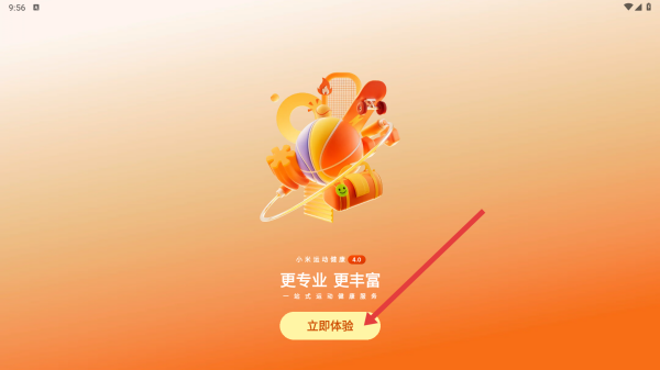 1、打開小米運動健康,會看到帶有運動元素、寫著更專業(yè) 更豐富的啟動頁,點擊立即體驗進入下一步。