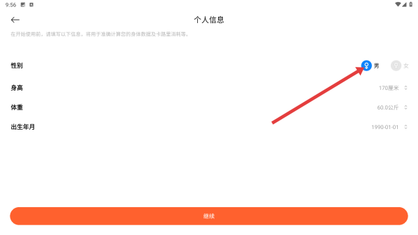 3、來到個人信息頁面,選擇性別,填寫身高、體重、出生年月等信息,填好后點擊繼續(xù)。