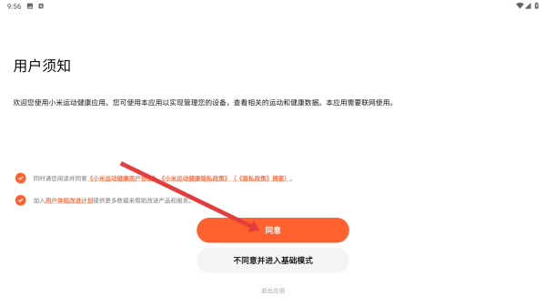 2、進入用戶須知頁面,閱讀后勾選同意相關協(xié)議,點擊同意按鈕,也可選擇不同意并進入基礎模式。