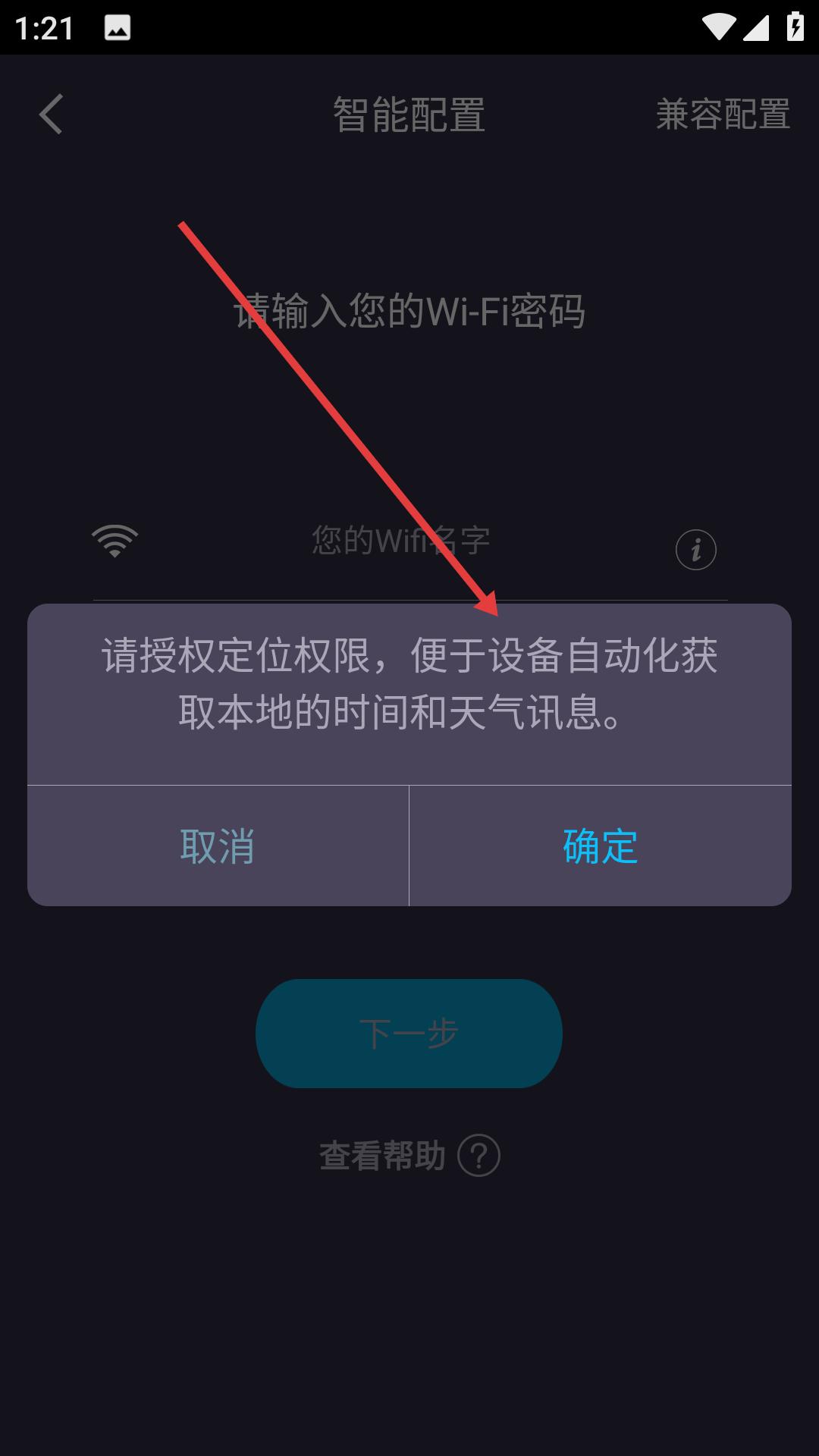 2、在我的時鐘智能配置頁面,提示需授權(quán)定位權(quán)限以獲取本地時間和天氣訊息,點擊確定按鈕進行授權(quán)。