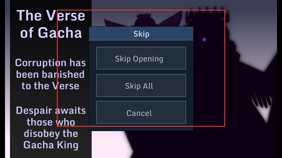 2、進(jìn)入后若有劇情,可選擇Skip Opening、Skip All或Cancel,跳過部分或全部劇情,快速進(jìn)入游戲核心內(nèi)容。