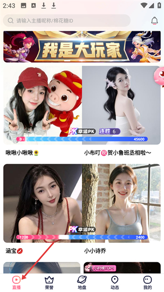 1、直播頁面有搜索欄,展示我是大玩家活動及主播PK畫面,如啾啾小啾啾與小布叮等主播的PK場景,可觀看直播互動。