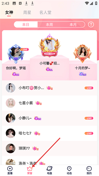 2、榮譽頁面分女神、周星、名人堂板塊,展示本日榜單,小可馨等主播位列其中,部分主播正進行直播,方便用戶關(guān)注。