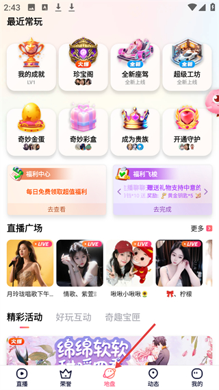 3、地盤頁面有我的成就、珍寶閣等功能入口,還有福利中心領(lǐng)福利、直播廣場看直播,以及精彩活動等內(nèi)容推薦。