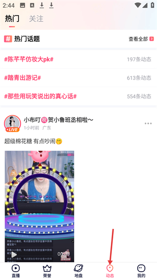 4、動態(tài)頁面設(shè)熱門、關(guān)注分區(qū),有熱門話題如陳芊芊仿妝大pk等,展示用戶小布叮的直播動態(tài),可查看更多動態(tài)互動。