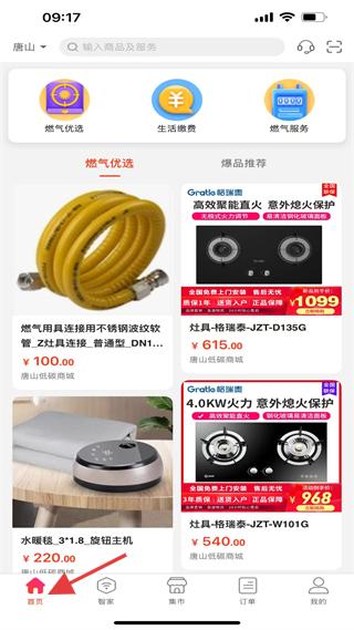 1、首頁唐山有燃氣優(yōu)選、生活繳費等功能入口,展示燃氣連接管、水暖毯、燃氣灶等商品,可選購燃氣相關(guān)用品。