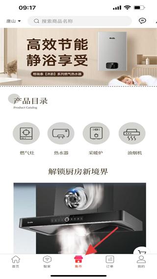3、集市頁有高效節(jié)能熱水器推薦,產(chǎn)品目錄含燃氣灶、熱水器等,展示油煙機等廚房電器,可瀏覽選購。