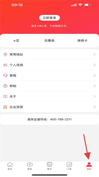 4、我的頁需立即登錄使用,有優(yōu)惠券、保修卡等功能入口,可設(shè)置常用地址、查看個人信息,還有服務(wù)監(jiān)督熱線。