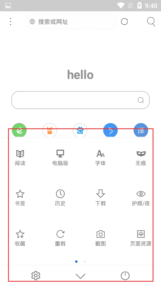 2、在首頁點擊相關(guān)圖標(biāo),可喚出隱藏的功能菜單,其中包含閱讀模式可優(yōu)化閱讀體驗,還有調(diào)整字體、開啟無痕瀏覽等功能,甚至支持頁面截圖、查看頁面資源。