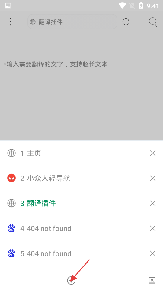 3、點擊翻譯進入翻譯插件頁面,可輸入超長文本進行翻譯,底部可查看當(dāng)前打開的頁面列表 ,點擊加號可快速新建頁面,方便用戶同時瀏覽多個網(wǎng)頁內(nèi)容。