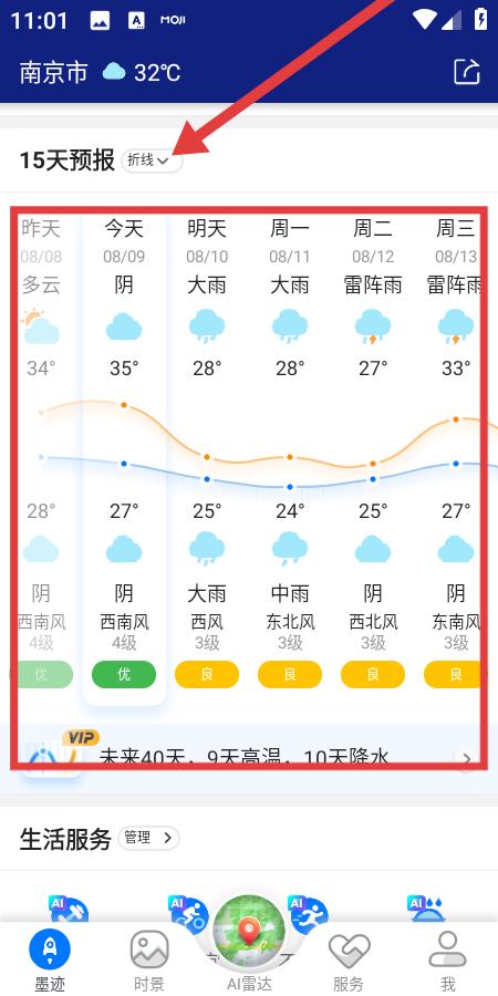 2、15天預(yù)報(bào)界面清晰折線圖展示溫度變化,每日天氣、風(fēng)力、空氣質(zhì)量標(biāo)注,今天陰明天大雨,未來40天含高溫降水提示,幫助用戶規(guī)劃長(zhǎng)期行程。