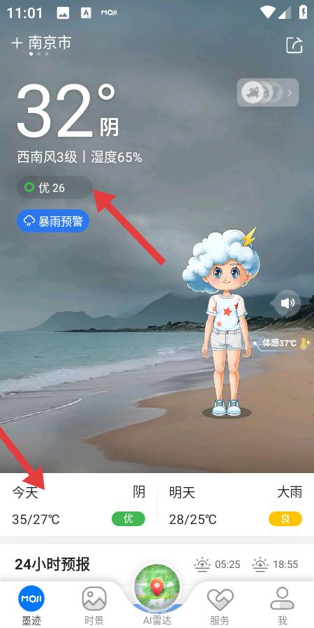 1、展示南京實(shí)時(shí)天氣32度陰,西南風(fēng)3級(jí)濕度65,空氣優(yōu)26并標(biāo)暴雨預(yù)警體感37度,直觀呈現(xiàn)氣象狀況。
